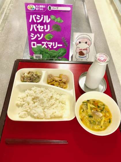 上段の写真は、本日の献立と給食図書です。本日の給食図書は「バジル パセリ シソ ローズマリー」でした。タイトルの4つのハーブ(香草)の特徴や育て方が載っている図書でした。