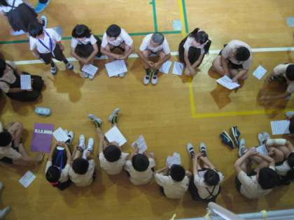 「なかよし集会」では、初めに自分の好きなものを挙げながら自己紹介をし、次に「サインを集めよう」ゲームをしました。短い時間でしたが、高学年が進んで下学年のお世話をし、低学年が高学年を頼もしく思うという本校の良き校風が見られた集会でした。
