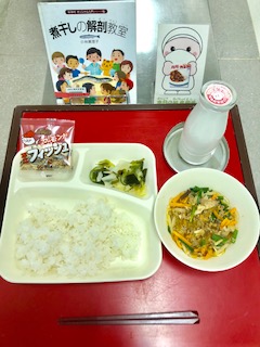 上段の写真は、本日の献立と給食図書です。本日の給食図書は「煮干しの解剖教室」でした。煮干しであるカタクチイワシを手でさいて解剖する方法が載っている図書でした。