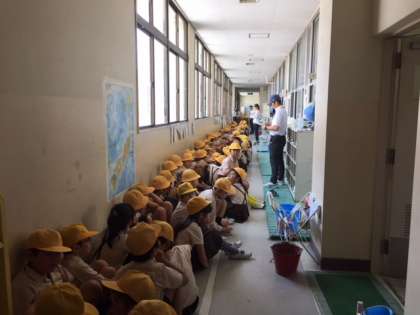 3時間目は避難訓練を行いました。初めに地震を想定して運動場に避難し、続けて津波を想定して全児童が4階に避難しました。その間、保護者の皆さんには、講堂で「給食ビデオ」を視聴していただきました。