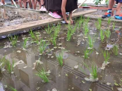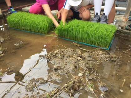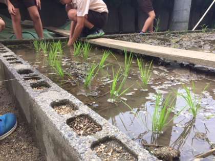 5年生は、校舎裏の水田で田植えをしました。イネの苗を一本ずつ水田の泥の中に植えていきます。5年生の子どもたちは「泥の中に手をつっこんだけど、楽しかったです。」「秋になってお米ができるのが楽しみです。」等と言っていました。