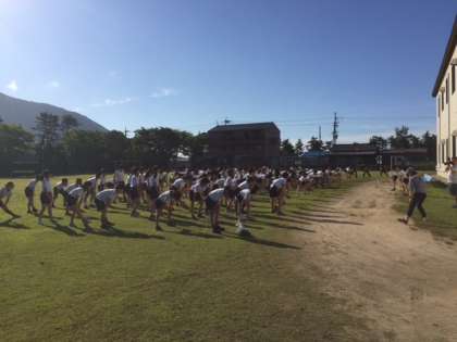 2日目の朝は良いお天気で、朝7時からみんなで元気に朝会をしました。朝食の後、うどん作りをする予定です。