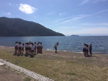 うどんができるのを待っている間に、琵琶湖岸で写真を撮ったり、芝生のグラウンドで思いっきり遊んだりしました。マキノの美しい自然が心に残りました。