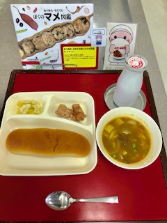 写真は、本日の献立と給食図書です。本日の給食図書は「ぼくのマメ図鑑」でした。大豆や金時豆等の食用のマメや、カラスノエンドウ等の野生のマメが精密画で載っている図鑑でした。