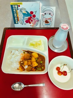 本日の給食を食べてみて児童たちは「さくらんぼがあまくて美味しかった。」「ハヤシライスもさくらんぼもおかわりした!」等と感想を述べていました。