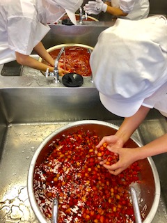 下段の写真は、さくらんぼを洗っているところです。大阪市では、くだものは水で三回洗います。