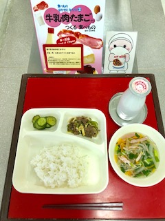 上段の写真は、本日の献立と給食図書です。本日の給食図書は「牛乳・肉・たまごからつくる食べもの」でした。チーズやハム、マヨネーズ等の加工食品の作り方が写真付きで載っている図書でした。