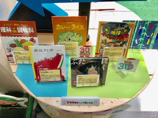 玄関ホールの給食図書コーナーに展示しています。それぞれの給食図書は、学校ホームページの「本日の給食献立」でも紹介しています。