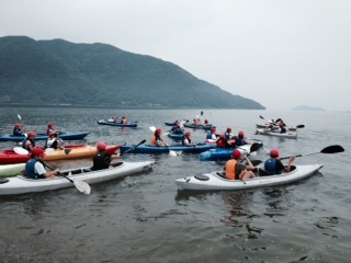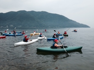 午前中降っていた小雨も昼からはあがって、楽しみにしていたカヤック体験ができました。初めての経験でしたが、みんなすぐに慣れて楽しく漕いでいました。