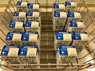 下段の写真は、今学期から紙パックに変更となった牛乳です。教室でストローをさして飲みました。(牛乳業者、内容量は今まで通りいかるが牛乳200mlです。)