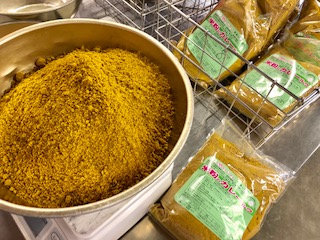 下段の写真は、本日使用した、米粉のカレールウです。見た目や味は小麦粉のルウと違いがありませんでした。