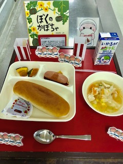 上段の写真は、本日の献立と給食図書でした。本日の給食図書は「ぼくのかぼちゃ」でした。男の子とお母さんが庭の畑でかぼちゃを育てる様子を描いた、切り紙版画の物語でした。