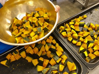 下段の写真は、焼きかぼちゃを配缶しているところです。