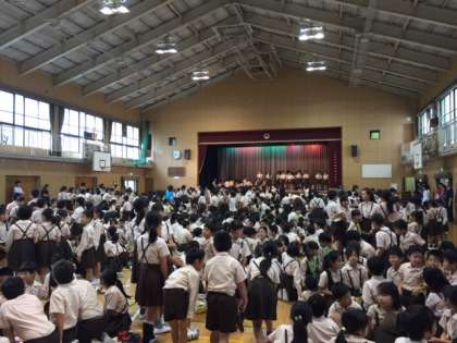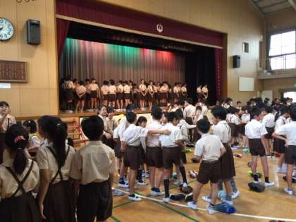 9月27日(木)今日の児童集会は、1〜6年までの「なかよし班」で、「世界旅行に行こうよ」というゲームをしました。「世界旅行に行こうよ、パスポートだって持ってるし、お金だって持ってるもん」という楽しい言葉と共に、国名の字数と同じ人数のグループを作ります。短い「カナダ」から、長い「ボスニアヘルツェゴビナ」まで子どもたちはワイワイ言いながら、異学年のグループを作りました。