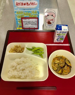 上段の写真は、本日の献立と給食図書でした。本日の給食図書は「えだまめきょうだい」でした。自分たちにぴったりの島を探しに海に飛び出した枝豆の兄弟の絵本でした。