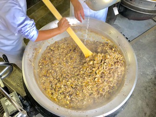 下段の写真は、マーボーなすに水溶きでんぷんで仕上げのとろみをつけているところです。