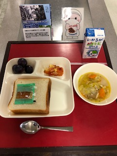 本日の献立は「鶏肉とてぼ豆のスープ煮・じゃがいもとトマトのチーズ焼き・ぶどう(巨峰)・食パン(りんごジャム)・牛乳」でした。