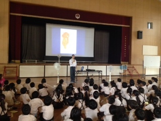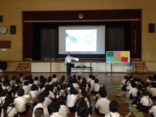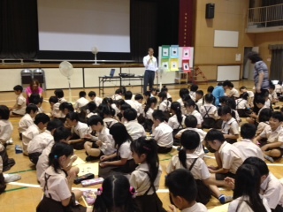 最後に"Let's go halves"(はんぶんこしよう)という絵本を読み聞かせしてもらいました。授業後子どもたちは"Thank you""See you!"と口々に言ってEddy先生とハイタッチをしてさようならをしました。感想には「たのしかったです。またやりたいです。」「ほかのえいごのいいかたもしりたいです。」と書いている子が多くいました。また2学期以降も取り組む予定です。