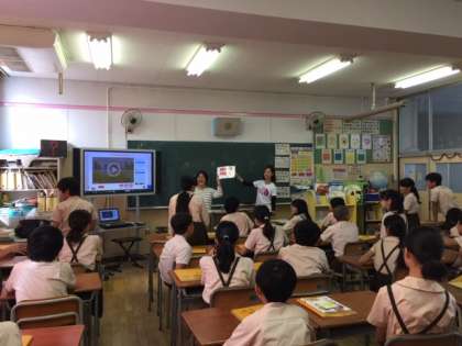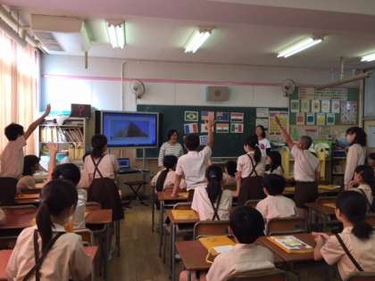 初めに「国名ジングル」をして、「国名クイズ」にトライし、次に「世界遺産クイズ」にチャレンジしました。6年生の子どもたちは、国や世界遺産の英語の言い方を知って、積極的に発音していました。これから、自分の行きたい国やしたいことを考えて、カードに書いたりスピーチしたりする予定です。