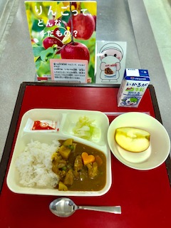 上段の写真は、本日の献立と給食図書でした。本日の給食図書は「りんごって、どんなくだもの?」でした。りんごの種類や育て方、いろいろな食べ方等が載っている図書でした。