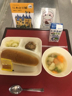 上段の写真は、本日の献立と給食図書でした。本日の給食図書は「にわとり城」でした。ひとりぼっちの男の子が一羽のにわとりと旅に出て怖い魔物となぞなぞ対決をする物語でした。