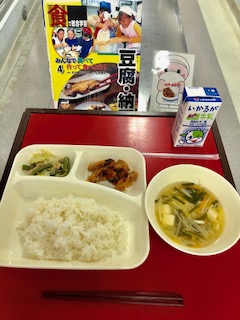 上段の写真は、本日の献立と給食図書でした。本日の給食図書は「食で総合学習 豆腐・納豆」でした。大豆を使って、豆腐や納豆を一から作る工程が載っている図書でした。