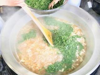 下段の写真は、スープににらを入れているところです。