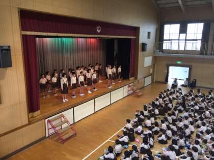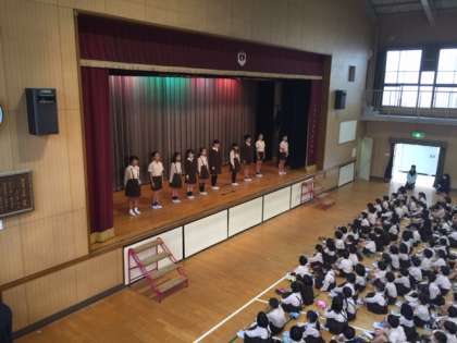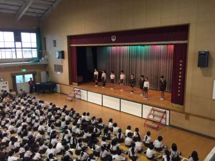 続けて、児童会後期の運営委員、代表委員、委員長のあいさつがありました。それぞれが「鶴見南小学校を、明るく楽しい学校にするためにがんばります。」等と舞台から堂々と決意表明しました。聞いている全学年の子どもたちも、そうした高学年の姿をしっかり見て、話を聞いていました。