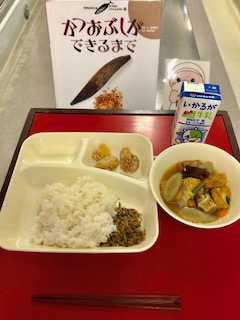 上段の写真は、本日の献立と給食図書でした。本日の給食図書は「かつおぶしができるまで」でした。漁港で水揚げされたかつおから、かつおぶしが出来るまでの作業の写真が載っている図書でした。