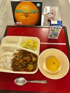上段の写真は、本日の献立と給食図書でした。本日の給食図書は「みかんのひみつ」でした。みかんの実を房の中の粒々のところまでばらばらにした写真や、みかんが実る成長の様子の写真等が載っている絵本でした。