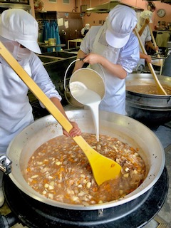 下段の写真は、水で溶いた上新粉をハヤシライスのルウの中へ注いでいるところです。
