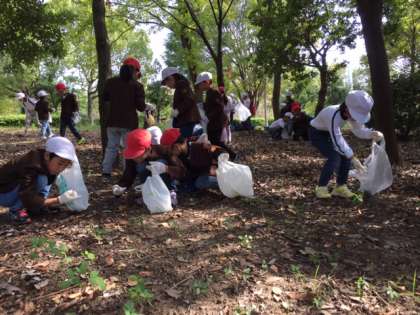 10月18日(木)今日も朝から良いお天気で、2年生が秋の遠足で鶴見緑地に行ってきました。「秋みつけをしよう」というめあてで、ビニル袋を持って木々の間に入って行き、ドングリや、赤や黄色に色づいたきれいな落ち葉をたくさん集めました。