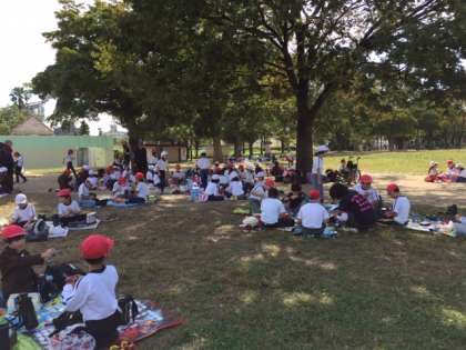 お昼は、広い芝生でおいしいお弁当をいただき、おやつを食べた後、大なわやフリスビーやおにごっこをして、楽しく遊びました。