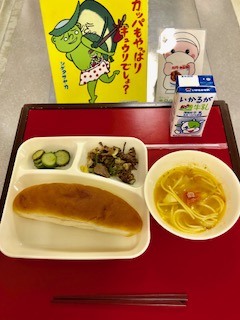 上段の写真は、本日の献立と給食図書でした。本日の給食図書は「カッパもやっぱりキュウリでしょ」でした。いつもきゅうりのことばかり考えているカッパさんと、カッパさんに助けられたきゅうりさん(実は…)のお話でした。