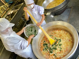 下段の写真は、スープスパゲッティにパセリを加えて仕上げているところです。