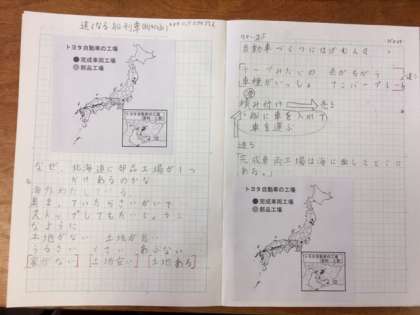 単元名は「工業生産を支える人々」で、本時の目標は「自動車の完成車両を輸送する際は、高速道路を使った方法もあるので、臨海部でなくても自動車の完成車両工場は造られる。」でした。5年生の子どもたちは、学習課題に対して、資料をもとに話し合い、多様な考え方を出してきました。これは新指導要領がめざす「主体的・対話的で深い学び」を実践したものといえます。
