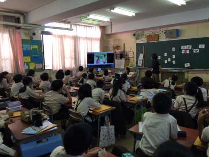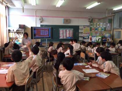 今日は先週に続いて、3,4年生がTST(鶴南ストーリータイム)をしました。3年生では、英語の手遊び歌で遊んだり、アルファベットビンゴを楽しんだりしました。講師の赤松先生は、3年生でも自分のイニシャルが言えて、アルファベットがよく身に付いていますねと言われていました。