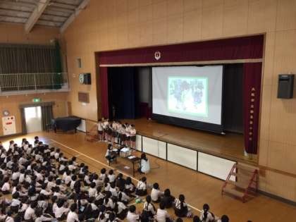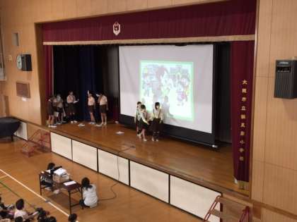 10月25日(木)朝の児童集会で、健康委員会が、良い姿勢について伝えるために、紙芝居をしました。