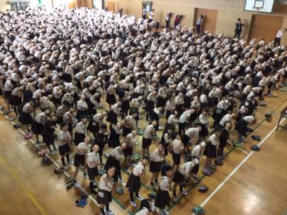 次に全児童で「しせいすっきりたいそう」をしました。手を組んで体を曲げる動作で、姿勢の良さがわかるというもので、みんな一生懸命に取り組んでいました。