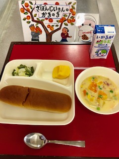 上段の写真は、本日の献立と給食図書でした。本日の給食図書は、「ざぼんじいさんのかきのき」でした。自分の家で採れたたくさんの柿を独り占めするざぼんじいさんと、その隣に引っ越してきたおばあさんとのお話でした。
