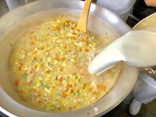 コーンクリームシチューは、ベーコン、鶏肉、にんじん、じゃがいも、コーン等が入った牛乳を使ったシチューでした。シチューは通常、小麦粉を炒めたルウでとろみをだしますが、本日は小麦粉アレルギーの児童に配慮して上新粉(米粉)でとろみをだしています。