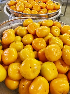 柿は、本日は和歌山県産の平核無柿が1人に1/4個付きました。平核無柿は渋柿の渋を抜いた柿です。