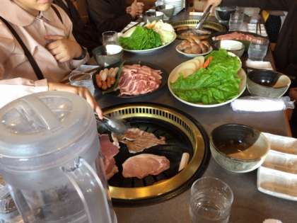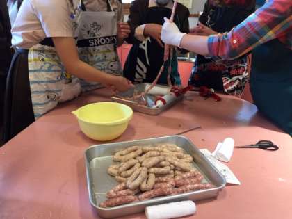 もくもくファームでは、ミニブタショーやザリガニ釣りなどを楽しんだ後、バーベキューの昼食を食べました。それから手作りソーセージ体験をしました。