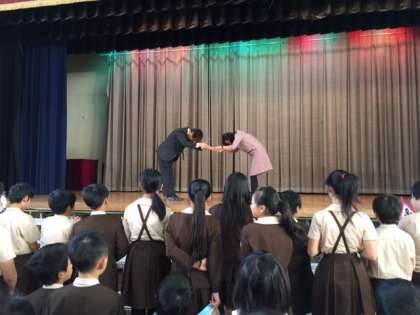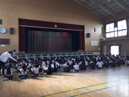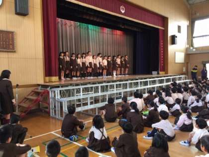 全校朝会は講堂で行い、校長先生からは、学校薬剤師の小谷いずみ先生が、長年に亘って本校の保健管理に尽くしてくださったことを大阪市長から表彰された紹介がありました。