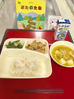 上段の写真は、本日の献立と給食図書でした。本日の給食図書は、「ぶたのたね」でした。足が遅くて獲物を捕まえられないお腹を空かせたオオカミが、キツネ博士に豚のなる木のタネをもらいます…さて、その後、どうなったでしょう。気になる方は、是非読んでみてくださいね。