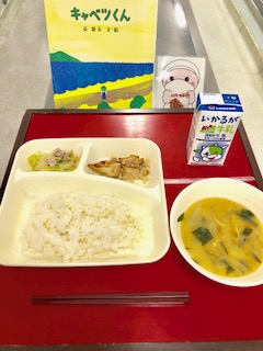 上段の写真は、本日の献立と給食図書でした。本日の給食図書は、「キャベツくん」でした。キャベツくんを食べようとすると、ヘビさんもゴリラさんもみんなキャベツになってしまう楽しい絵本でした。