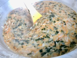 下段の写真は、みそ汁を仕上げているところです。