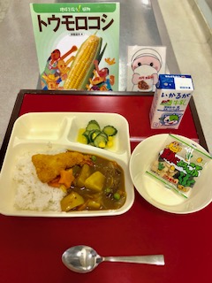 上段の写真は、本日の献立と給食図書でした。本日の給食図書は、「地球を救う!食物 トウモロコシ」でした。トウモロコシについて、「植物」「作物」「歴史」「パワフルさ」という4つの視点で書かれている図書でした。