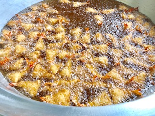 えびフライカレーライスは、牛肉、にんじん、たまねぎ、じゃがいも等が入ったカレーライスの上に、揚げたエビをのせて食べる、いつもより少し豪華な献立でした。また、星型のラッキーにんじんもルウの中に入っていました。