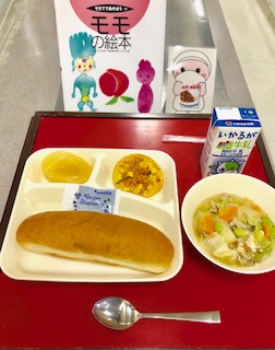 上段の写真は、本日の献立と給食図書でした。本日の給食図書は、「モモの絵本」でした。白鳳など、私たちが普段食べている品種のモモや、桃太郎に出てるとんがった形のモモ等が載っている絵本でした。